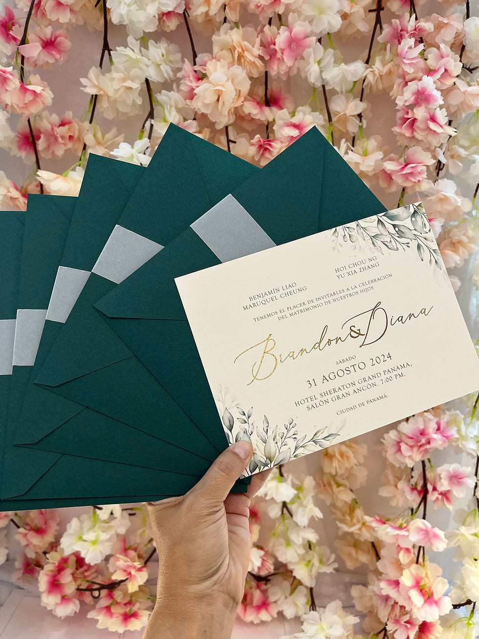 Invitaciones con detalles de hojas, en gamas de blancos, verdes y cremas
